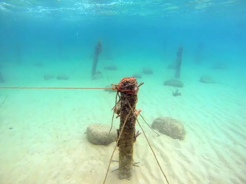这是一个为期3年上百万的国家级的珊瑚礁培育项目,在国家海洋局官网上能查到,项目由海南大学的一个教授带几个学生实施,实施了两年的工程,甲方与监理方都没见过珊瑚培育得怎么样了,然后有一天,甲方(也就是上面那个保护站)与监理公司请我去海底给他们看看工程到底如何了,然后大叔就浮潜着给他们拍了这几张相片,上百万呀,培育了两年呀,专家教授呀,