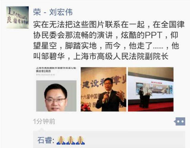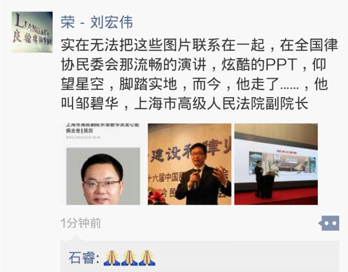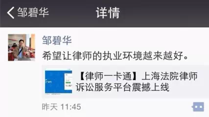昨日,由他主导推动的上海法院律师服务平台刚刚上线运行。邹碧华在朋友圈里转发了这条消息,2并留下最后一句话:“希望让律师的执业环境越来越好。”