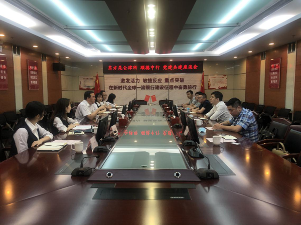 我支部郜超书记介绍了广东东方昆仑律师事务所基本情况,并从思想教育、活动开展、党建特色,党建所建相互促进等方面介绍了东方昆仑律师事务所党支部党建工作情况。石军副行长对我所党建工作给予了高度评价。